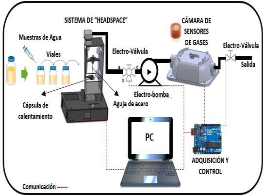 Un concepto muy general de la nariz electrónica es la de un instrumento que consiste en un conjunto de sensores electroquímicos con una especificidad parcial y un sistema adecuado de reconocimiento de patrones, capaz de reconocer olores simples o complejos En la Figura 6 se aprecia el sistema de nariz electrónica disponible para el desarrollo de este proyecto, la cual consta de las siguientes partes (Gualdrón et al., 2014):