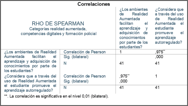Una vez analizados los datos generados en los antecedentes, frecuencia y correlación bivariado mediante Rho de Spearman de las categorías y elementos claves, se pudo establecer que la herramienta tecnológica de Realidad Aumentada, tiene un impacto positivo, encontrando**correlación significativa del ,975** y Sig. (bilateral) de ,000 en la variable de ambientes de realidad aumentada, adquisición de conocimientos y aprendizaje autorregulado como se evidencia en la imagen 6, confirmado con la teoría de (Cabero Almenara et al., 2017) que indica que la realidad aumentada ayuda en la pedagogía para comprender los diferentes estilos de aprendizaje, de una forma interactiva y didáctica sobreponiendo elementos virtuales y físicos, en la categoría de competencias digitales se obtuvo un coeficiente de correlación de ,900** y Sig. (bilateral) de ,000 para la variable uso de plataformas e intercambio de información digital y comprensión en las temáticas del quehacer policial, como lo menciona Díaz (2016) a través del recurso tecnológico de RA, el estudiante observará las nuevas tendencias y tecnologías educativas en ambientes propicios para la adquisición de conocimientos, en cuanto a la categoría de formación policial la correlación equivale al ,848** que corresponde a la implementación de escenarios de Realidad Aumentada en diferentes asignaturas y temáticas establecidas en el currículo educativo que brinda la ECSAN, donde los futuros Subtenientes podrán apropiar mejor la actividad policial, confirmado con la teoría de (Lancheros & Jaimes, 2015) donde refiere que el instrumento de RA, es utilizado en diferentes campos militares, como medio de formación y entrenamiento.