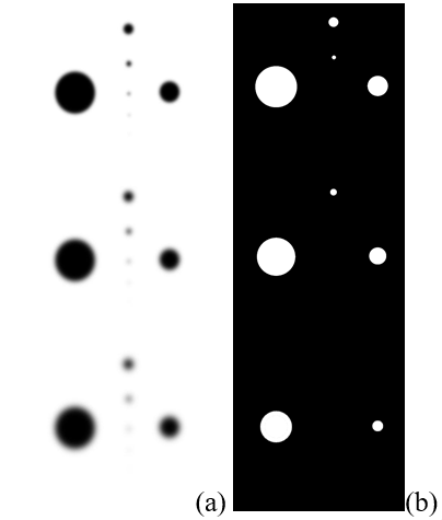 Como la idea inicial del artículo es tener una aproximación del tamaño de la gota en cada imagen, se debe tener un patrón de comparación. El rendimiento del método se probó con una imagen de referencia que simulaba diferentes niveles de desenfoque de la gota aplicando un filtro gaussiano con radio incremental. En este caso se trataba de un patrón experimental realizado a partir de una imagen de referencia con seis niveles, cada nivel con un filtro gaussiano BLUR con radios de 0px (verdad base), 2,5px (imagen perfecta posiblemente adquirida por la cámara), 5px (sólo se considera desenfocado el círculo mínimo viable), 10px, 15px y 20 px (totalmente desenfocado). Cuando el radio del filtro es mayor que el diámetro de la gota, no se puede medir con precisión la anchura de la gota a partir de su imagen de sombra, por lo que estas gotas deben descartarse. La Fig. 5 muestra la mitad inferior de la imagen de referencia juto con su versión binarizada después de aplicar el umbral local automático de Sauvola. Puede observarse que los círculos con mayor grado de desenfoque quedan excluidos tras aplicar el filtro, simulando así gotas con cierto grado de desenfoque.
