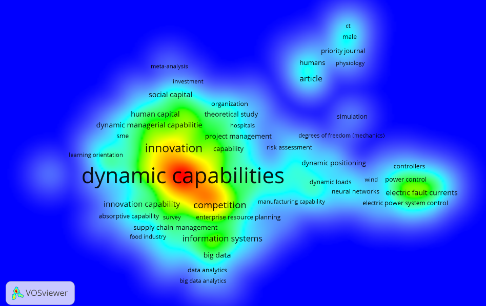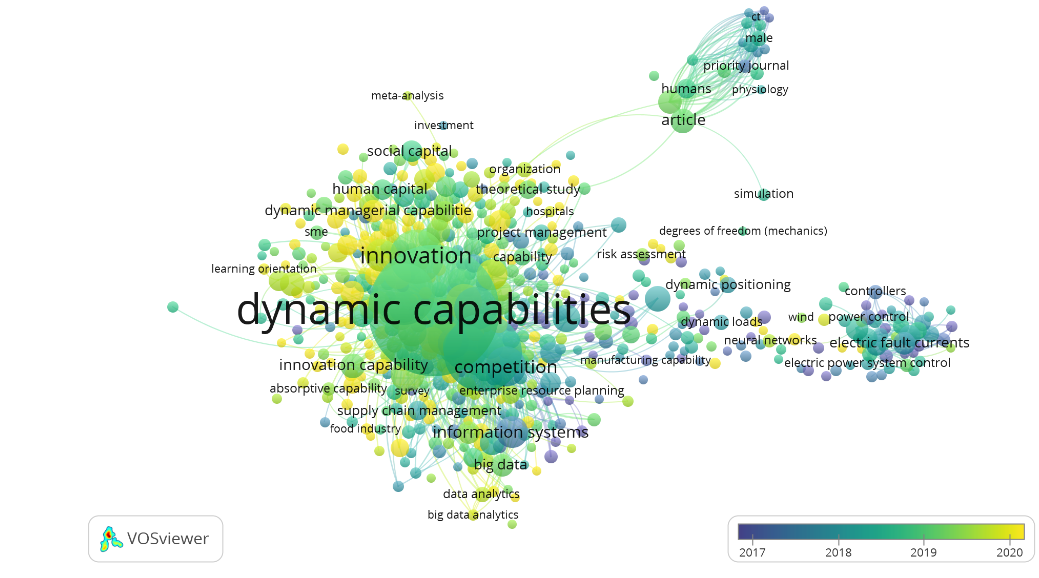 A través de los resultados de visualización obtenidos, es posible tener una comprensión de la estructura relacionada a la temática de las direcciones de investigación de las capacidades dinámicas más importantes 2017-2020. A partir de la visualización mapas bibliométricos etiquetados se pueden extraer varias conclusiones. En primer lugar, el mapa muestra en la ventana de análisis, una macro línea de investigación sólida, que abarca los trabajos sobre capacidad dinámica, adaptabilidad, integración, reconfiguración, estrategia, planeación estratégica, trabajo en equipo, transformación, capacidad de adaptación, capacidad de absorción, capacidad de innovación, rendimiento financiero, desarrollo de nuevos productos, cultura organizacional, productividad, resiliencia, estrategia de flexibilidad entre otros; sin embargo a nivel global, aún es incipiente la investigación en algunas Capacidades Dinámicas, en especial en Latinoamérica; este es el caso de la capacidad dinámica de gestión financiera y las relacionadas con la gestión del talento humano.