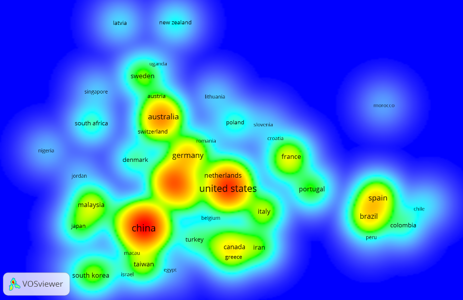 En otro nivel de análisis es importante resaltar los países con mayores investigaciones sobre este tema, estos son: China, Estados Unidos (con mayor densidad), Italia, Francia, Taiwán, Sur África, Japón, Australia, España, Brasil, Croacia, entre otros (Figura 5). De Latinoamérica se ubican Colombia, Chile y Perú, que se concentran en el color azul, lo que permite inferir que existen pocas investigaciones al respecto.