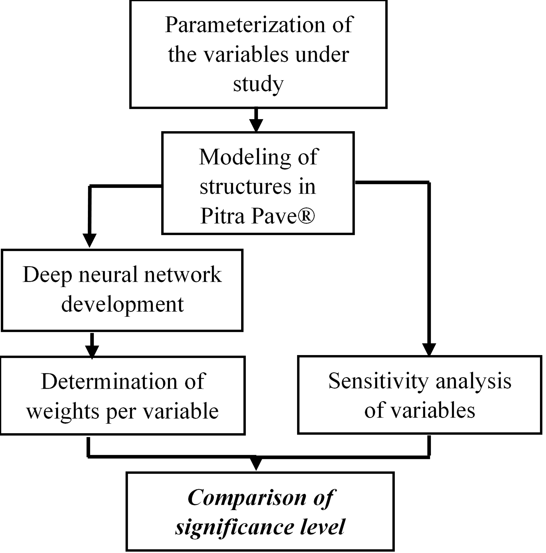 The working scheme applied in this research is outlined in Fig. 1. It primarily stemmed from the selection of 108 flexible pavement structures, resulting from a parameterization of the resilient modulus (RM) and layer thickness (LT) for each of the structural layers that comprised a typical flexible pavement structure. Next, a modeling stage was carried out using the Pitra Pave® software, which provided the necessary data for assessing the sensitivity level and developing the DNN models. Subsequently, validations were performed by directly comparing the outputs gathered from the DNN models and MET models. Afterward, an evaluation was conducted on the differences observed in the various pavement structures for each structural design parameter to determine the significance of the design variables. Finally, the DNN models yielded the connection weights per design variable needed to compare the level of importance of each of these parameterized variables.