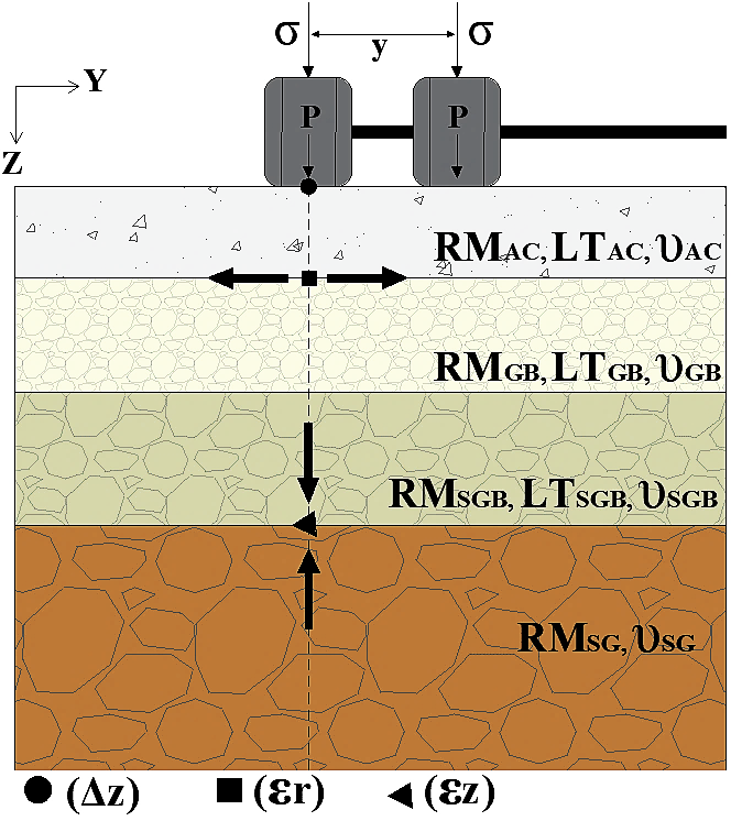 The typical flexible pavement structure adopted is shown in Fig. 2, including the subgrade (SG) and three structural layers: asphalt concrete (AC), granular base (GB), and granular sub-base (GSB). The design parameters that differentiated each pavement structure were the thickness of AC (LTAC), the thickness of GB (LTGB), the thickness of GSB (LTGSB), the resilient modulus (stiffness) of AC (RMAC), the resilient modulus of GB (RMGB), and the resilient modulus of GSB (RMGSB). By varying the thicknesses, it was possible to establish four geometric configurations (C1, C2, C3, C4; Table 1), while for the moduli, the values indicated in Table 1 were adopted. These values generated different combinations, defining the 108 simulated structures. Additionally, the Poisson's ratio (υ) and resilient modulus of the subgrade (RMSG), tire load (P), contact pressure between the tire and the pavement (σ), radius of the load area (r), and tire spacing (y) remained constant. Table 2 presents the values adopted for these parameters.