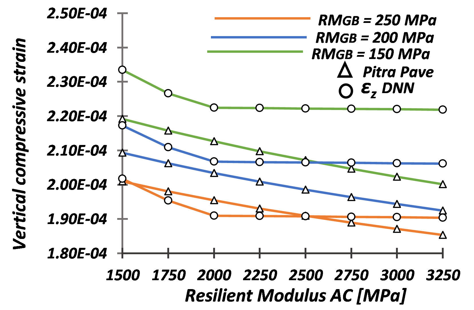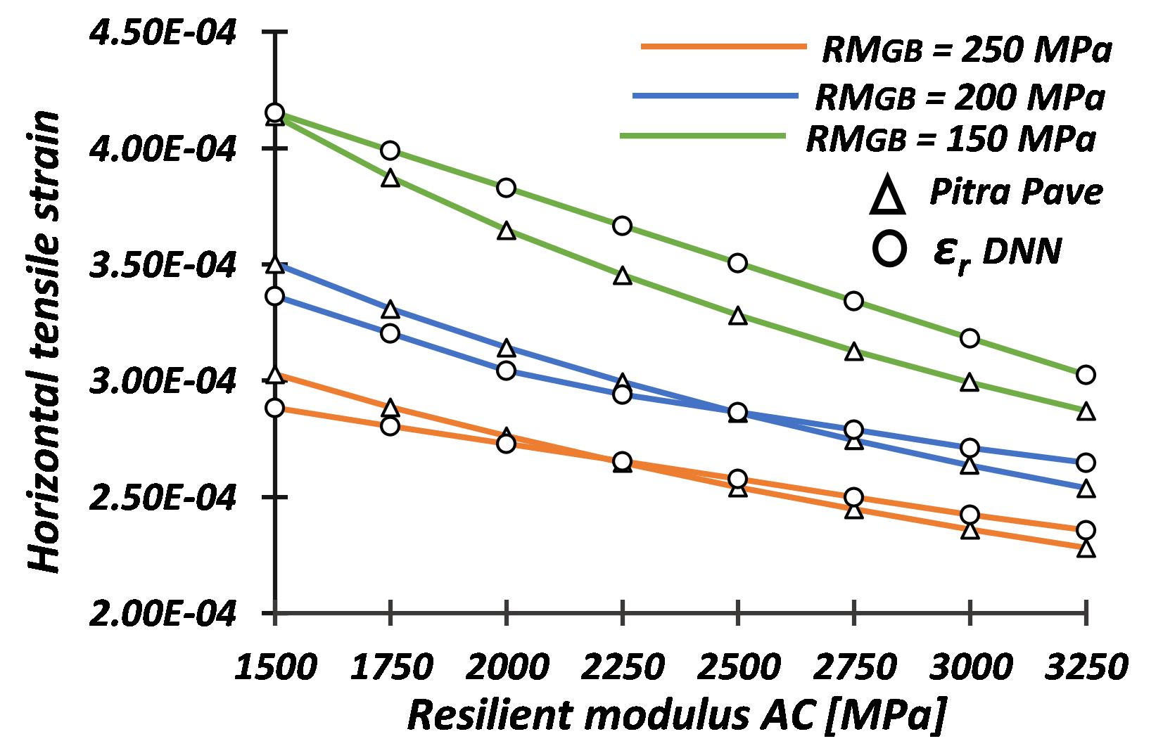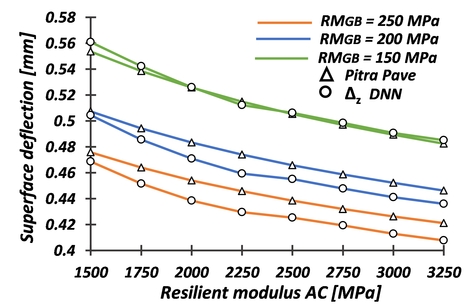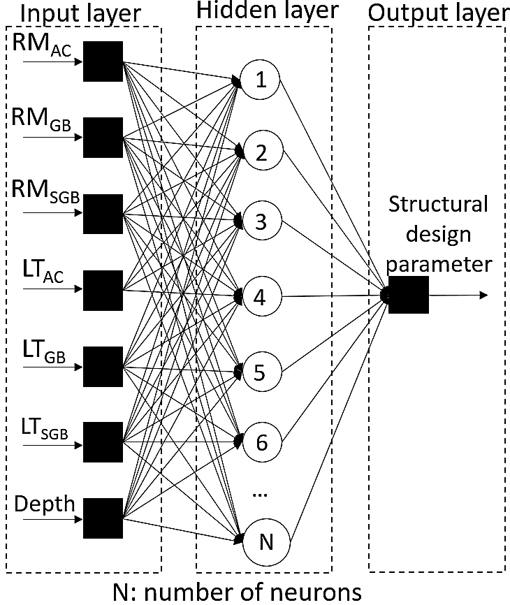 This study seeks to assess the level of sensitivity of design variables on the structural design parameters of flexible pavements for LVTR based on a deep neural network (DNN) for each structural design parameter. The predictor DNN models were constructed using synthetically generated data from the Pitra Pave® software (Loría-Salazar et al., 2017), which models flexible pavement structures based on the multilayer elastic theory (MET). The variables assessed in this study correspond to the primary structural design parameters evaluated in mechanistic design methods (Corté & Goux, 1996). These are horizontal tensile strain at the bottom of the asphalt concrete layer (\(\varepsilon_r\)), vertical compressive strain at the surface of the subgrade (\(\varepsilon_z\)), and surface deflection (\(\Delta_z\)). However, besides assessing the structural design parameters, the MET model allowed computing the deflection (vertical deformation), vertical strain, and horizontal strain at different depths. These data permitted additional refinement for the development of the DNN models.