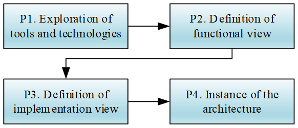 To conduct this research, four methodological phases were defined (Figure 1): 1) An exploration of technologies and tools; 2) The definition of the functional view from the architecture; 3) The definition of the implementation view; and 4) The prototype or proof-of-concept derived from the architecture based on what was presented in