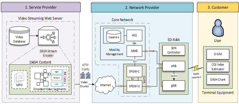 . In the service provider domain, a video database stores the content offered to the customer. The source of information may be an external content provider. The multimedia files are taken to a DASH stream encoder module responsible for segmenting and encoding them in different qualities. The encoded video segments are stored on a web server, which in turn distributes them to the client. Based on this, the DASH encoder defines a manifest file called the Media Presentation Description (MPD), that describes the multimedia content, the qualities, and how it is divided into segments depending on the available bandwidth on the client-side. This descriptor is necessary to synchronize communication with the client to serve content as needed. Moreover, the domain of the network provider is in charge of providing a gateway for end-to-end communication between the client and the server. In this case, a cellular mobile network is based on an architecture supported by the IP protocol. The functional modules that make up the mobile network are the CN and the SD-RAN. The CN performs the tasks of registration and authentication of the user terminal equipment through the components of the mobility management sub-module and other tasks from the control plane such as session management, tracking and paging of the user terminal, and the establishment of terminal-network connections. The nodes SPGW-C and SPGW-U are responsible for providing service and connectivity to the subscriber through an internal packet data network that allows communication with external networks