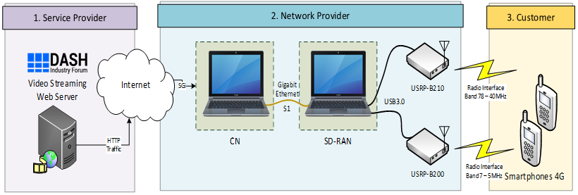 To validate the relevance of the architecture proposed in this paper, a proof-of-concept has been implemented. This section shows the throughput results obtained in the descending link from the cellular mobile network when consuming videos on the on demand streaming service deployed from the provider domain. To access this service, a pair of user terminal equipment has been used; it is located in the client's domain and is compatible with 4G wireless technologies. Figure 4 shows the service prototype built from the architecture defined in this paper.
