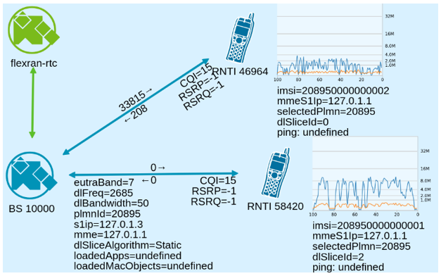 Once authenticated and registered in the mobile network, the user terminal equipment was assigned to a different Slice for the descending link. The terminal equipment identified with the IMSI 208950000000002 was assigned to Slice 0, and the one identified with the IMSI 208950000000001 to Slice 2.