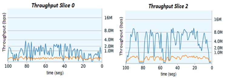 In addition, it is possible to observe a graph of the throughput experienced by the mobile network next to each user terminal equipment in the ascending link and descending link for each Slice. It should be noted that the Network Slicing functionalities were not applied to the ascending link channel (the network was not segmented). Both terminal types of equipment share the same channel in the ascending link. Figure 6 shows the throughput behavior (a) in Slice 0 and (b) Slice 2. It also indicates that the average throughput experienced by Slice 0 is less than the one achieved by Slice 2. Since the allocation of resources has been asymmetric, Slice 2 has more bandwidth resources, 70 percent of the total available (50 RB) enables higher transfer rates.