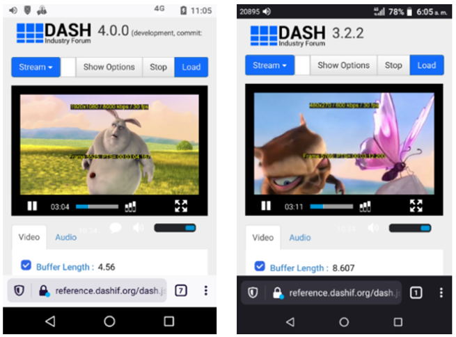 Finally, Figure 7 shows images that validate the consumption of the video streaming service on demand from the client's domain through user terminal equipment. This is made using the DASH client provided by DASH Industry Forum