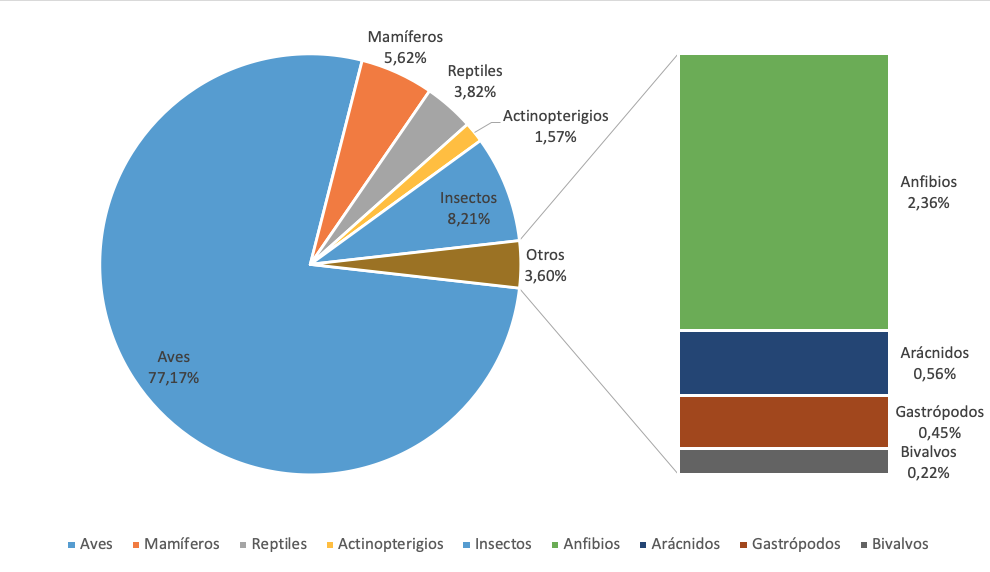 Para el desarrollo de esta fase se utilizó un conjunto de datos abiertos proporcionados por el Sistema de Información sobre Biodiversidad en Colombia (SIB), los cuales fueron organizados, depurados, y alojados en una base de datos en MongoDB Community Edition, para su posterior tratamiento. Como resultado, se identificaron 889 especies distintas que habitan actualmente en Valledupar o en algunos de sus corregimientos, de las cuales un 77,17% son aves, y la cantidad restante está distribuida entre mamíferos, reptiles, actinopterigios, insectos, anfibios, arácnidos, gasterópodos, y bivalvos tal y como se observa en la Fig. 1.