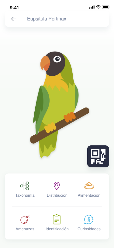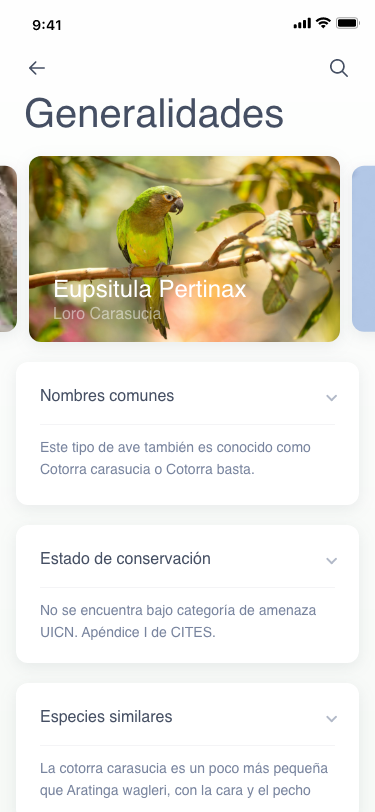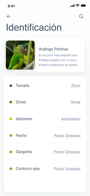 - Identificación: Aquí se muestra información relacionada con la taxonomía del animal, tales como tamaño, colores, formas, sonidos.