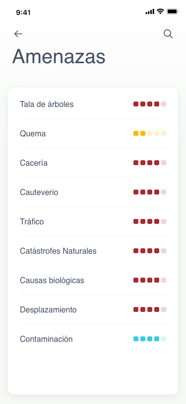 - Amenazas: En este ítem se muestra el grado de exposición de las especies, relacionado con tala, quema, tráfico, desplazamiento, cacería, cautiverio, contaminación.