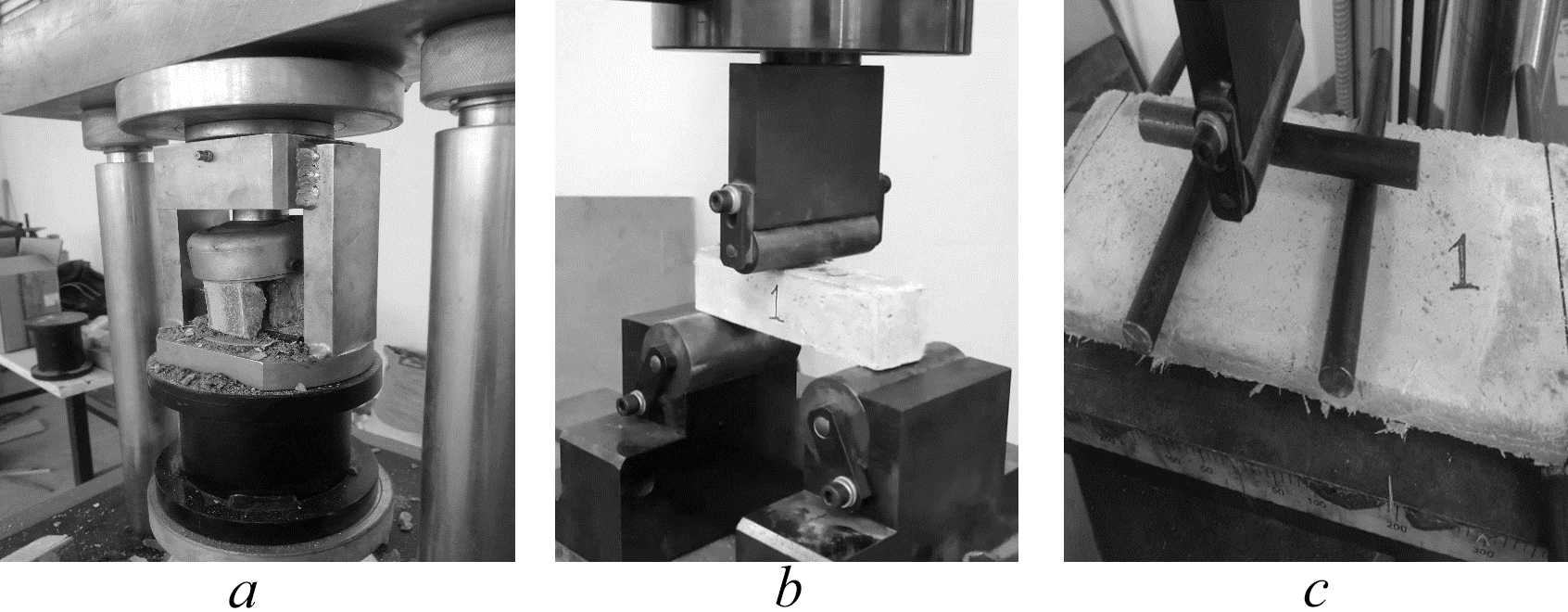 Fig. 1. (a) Compression test on 4x4x4cm cubes. (b) Flexural test on 4x4x16cm blanks. (c) Flexural test on 2x15x40cm plates.