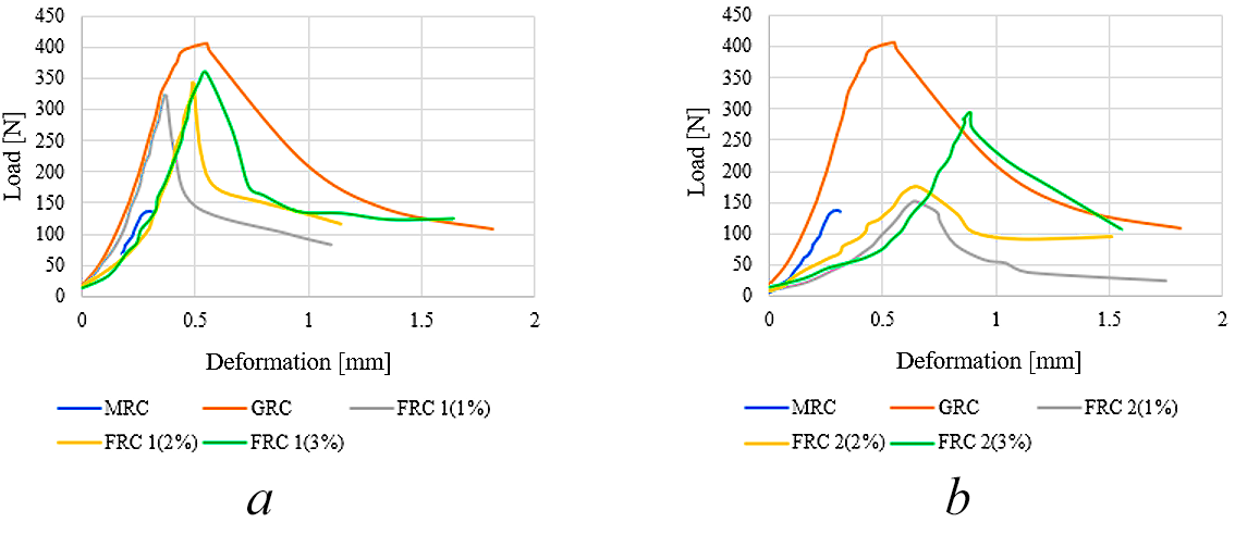 Fig. 2. (a) Load vs. strain curves of FRC-1 specimen (fique fibers). (b) Load vs. strain curves of FRC-2 specimen (guadua fibers). Compared with curves of MRC (without fibers) and GRC (AR glass fibers).