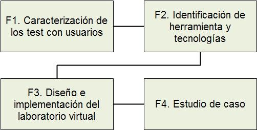 Para el desarrollo del presente trabajo fueron definidas cuatro fases metodológicas: F1. Caracterización de la estructura de los test con usuarios, F2. Identificación de herramientas y tecnologías para la implementación del laboratorio, F3. diseño e implementación del laboratorio virtual de usabilidad y F4. Caso de estudio (ver Figura 1).