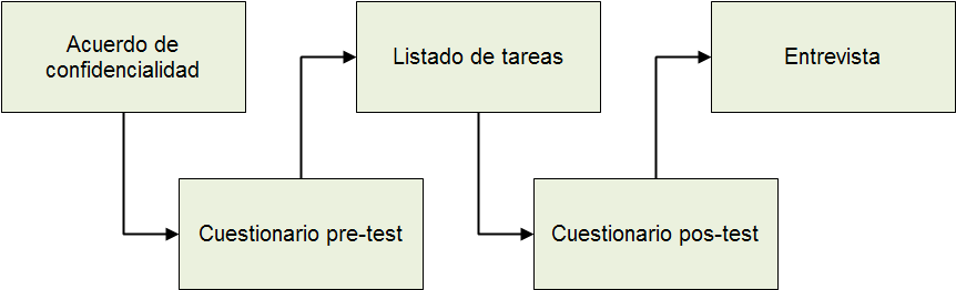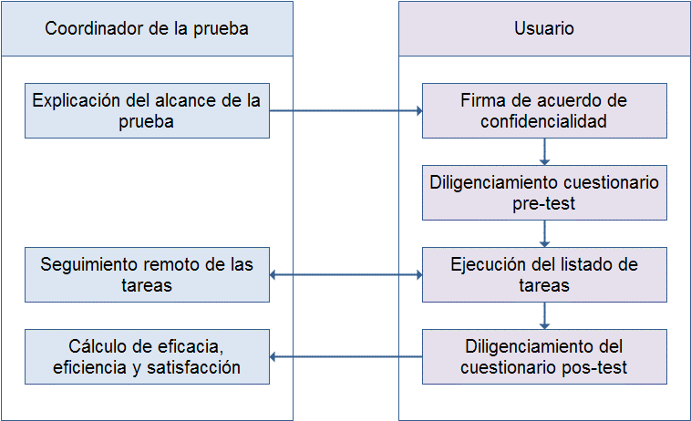 En el acuerdo de confidencialidad se les indica a los usuarios que participan en el test el alcance de la prueba, y se les explica que los resultados sólo serán utilizados con propósito académico. Dentro del cuestionario pre-test se busca obtener el perfil del usuario, así como la experiencia del mismo con herramientas similares a la evaluada en la prueba. En el listado de tareas, los usuarios desarrollan un conjunto de tareas dentro del software a evaluar, las cuales han sido definidas por los observadores o coordinadores de la prueba de manera previa. Posteriormente, se procede con el diligenciamiento del cuestionario pos-test, el cual cuenta con preguntas de tipo cuantitativo y cualitativo que buscan indagar. Con el primer tipo de preguntas se busca indagar mediante el uso de la escala Likert algunos aspectos del software evaluado tales como: interfaz gráfica, navegación, facilidad de aprendizaje, facilidad de uso, satisfacción en el uso, entre otros. Mientras que, con el segundo tipo de preguntas cualitativas se busca obtener posibles recomendaciones por parte del usuario de cara a mejorar la usabilidad y la funcionalidad del software evaluado. Finalmente, y de manera opcional, los coordinadores pueden realizar una entrevista con el usuario, con el fin de obtener información detallada sobre algunos aspectos específicos observados durante la prueba. Las anteriores etapas de la prueba son desarrolladas en el contexto de un laboratorio de usabilidad, el cual de manera convencional cuenta con dos habitaciones aisladas (para el usuario y para los coordinadores), de tal modo que desde la habitación de los coordinadores se puede hacer seguimiento a las tareas que desarrolla el usuario en un software específico.