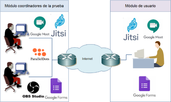 Teniendo en cuenta las operaciones a desarrollar tanto por parte del usuario como por el coordinador de la prueba, se seleccionaron un conjunto de herramientas para la conformación de la infraestructura del laboratorio virtual, las cuales permitan realizar las diferentes operaciones descritas en la Figura 3. Así, en la Figura 4 se ilustran la infraestructura del laboratorio virtual propuesto, teniendo en cuenta las diferentes herramientas seleccionadas y considerando los dos módulos o habitaciones (módulo de coordinador y módulo de usuario). En primer lugar, para la conformación de los instrumentos a usar en el test con usuarios (acuerdo de confidencialidad, cuestionario pre-test, lista de tareas y cuestionario pos-test) se escogió la herramienta provista por Google Forms, la cual posibilita la gestión de cuestionarios de selección múltiple, así como cuestionarios basados en preguntas abiertas. Así mismo, en cuando al seguimiento remoto a las tareas que realiza el usuario dentro del laboratorio, se seleccionaron las herramientas Google Meet y Jitsi, las cuales permiten a uno o varios coordinadores monitorear de manera silenciosa las interacciones que realiza el usuario con el software evaluado, mientras comparte pantalla con los coordinadores. Del mismo modo, para realizar la grabación tanto de las interacciones del usuario como de sus gestos y expresiones faciales, se seleccionó la herramienta libre OBS Studio, la cual permite capturar desde el equipo del coordinador las interacciones remotas del usuario. Las capturas de los gestos y expresiones faciales de los usuarios de la prueba pueden ser utilizadas para obtener indicadores de la satisfacción, teniendo en cuenta los heurísticos emocionales provistas por