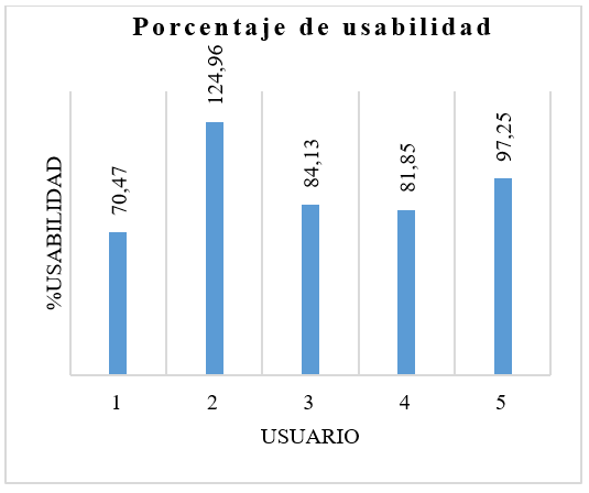 Con base en las respuestas de los usuarios a las preguntas del pos-test relacionadas con la satisfacción, se puede observar que el nivel de satisfacción oscila entre 3 y 3.6, lo que corresponde a un porcentaje de satisfacción comprendido entre el 60% y el 72% respectivamente. De este modo, se obtiene que el nivel consolidado de satisfacción en el uso del portal fue de 3.27, con un porcentaje de satisfacción del 65.33%, lo cual puede ser explicado porqué, aunque el portal permite buscar los productos de la tienda, el buscador ha sido implementado a partir del código del producto, lo que dificulta encontrar fácilmente un producto. Del mismo modo y como se mencionó previamente, los usuarios encontraron dificultad al ubicar los artículos en la sección de Blog del portal, lo cual pudo influenciar la valoración a nivel de satisfacción. Considerando los resultados obtenidos en las Tablas 2, 3 y 4, en la Figura 6 se muestra el porcentaje de usabilidad calculado para cada usuario, teniendo en cuenta los porcentajes de eficacia, eficiencia, así como el nivel de satisfacción.