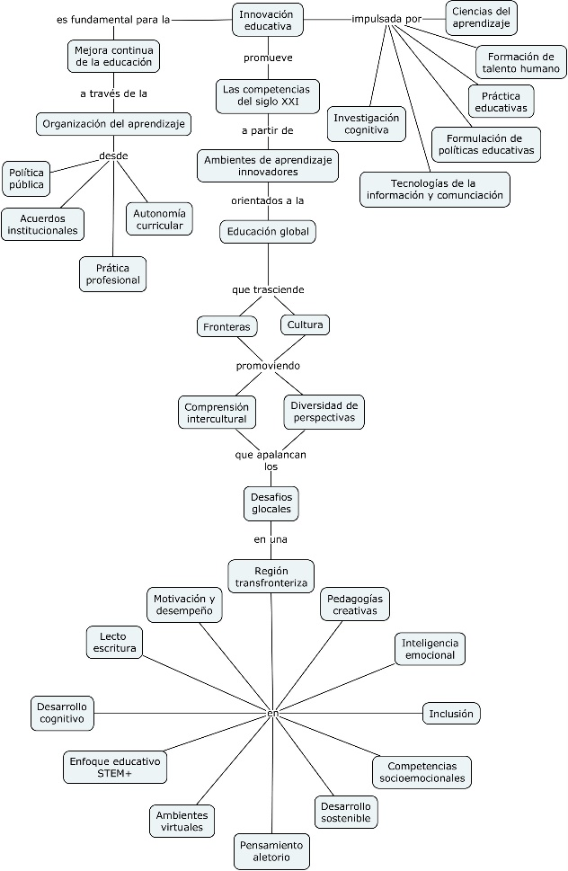 Del estudio realizado, se evidencia a partir de los relatos que la innovación educativa establece en gran medida el direccionamiento de la mejora continua de los procesos en el contexto educativo mediante la configuración y organización de las actividades de aprendizaje desde perspectivas esenciales en el contexto de la gobernanza y la gobernabilidad tales como las políticas públicas, los acuerdos institucionales, la autonomía curricular y la práctica profesional. Estos procesos de mejora continua desde la perspectiva disciplinar de las ciencias de la educación, son impulsados por las ciencias del aprendizaje, la investigación cognitiva y las prácticas educativas, no obstante, requieren de un apoyo transversal de la asertiva formación de talento humano, las tecnologías de información y comunicación y de las políticas educativas vigentes. La innovación educativa promueve con sustento en ambientes de aprendizaje innovadores la adquisición de competencias y habilidades para el siglo XXI totalmente orientados en una región transfronteriza por la educación global con el objetivo de trascender tanto a las fronteras como a la cultura, impulsando la comprensión intercultural y respetando la diversidad de las perspectivas con las que las personas que aprenden, desde el carácter transfronterizo de su ciudadanía, observan los desafíos en un contexto glocal. Se evidencia, también en el estudio, que los intereses manifiestos por las unidades de estudio en cuanto a las perspectivas investigativas en el contexto de los ambientes de aprendizaje se centran en:
