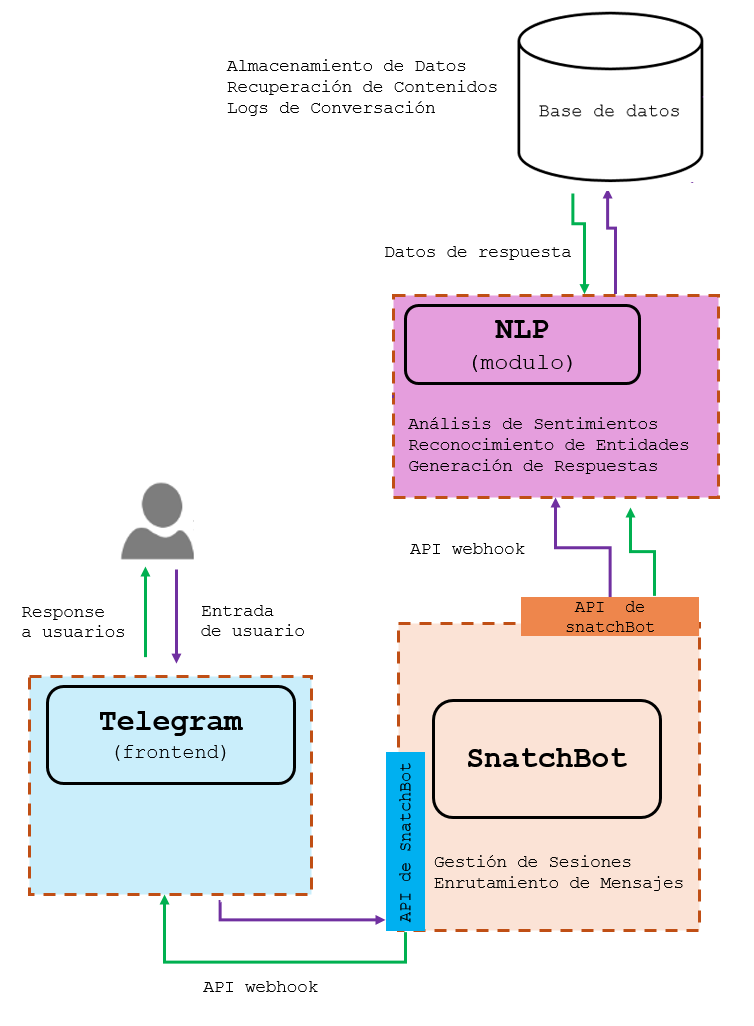 La arquitectura comienza con Telegram, una aplicación de mensajería popular, que sirve como interfaz de usuario. Esta capa es importante, ya que proporciona un punto de interacción familiar y accesible para los usuarios, quienes pueden enviar entradas y recibir respuestas de manera fluida. La API de Telegram se comunica a través de webhooks, asegurando la transmisión inmediata de datos a la API de SnatchBot, que forma el núcleo de la funcionalidad del chatbot.