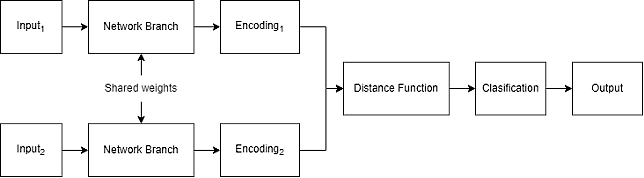 - Output: La salida de la red neuronal varía de acuerdo con el problema que se está resolviendo, clasificación, regresión o una medida de similitud entre las entradas. En clasificación de imágenes puede por ejemplo decir si dos imágenes de entrada pertenecen a la misma clase.