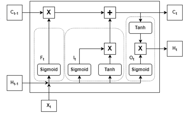 - Previous cell state (Ct-1): la celda de estado también es una salida del paso anterior t-1. Representa el estado interno de la célula, se comporta como una forma de memoria.