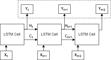 La Fig. 3. muestra una red LSTM desenrollada para una entrada de tres elementos en los tiempos t, t+1 y t+2. La entrada a la celda en el tiempo t consiste solo en el valor X