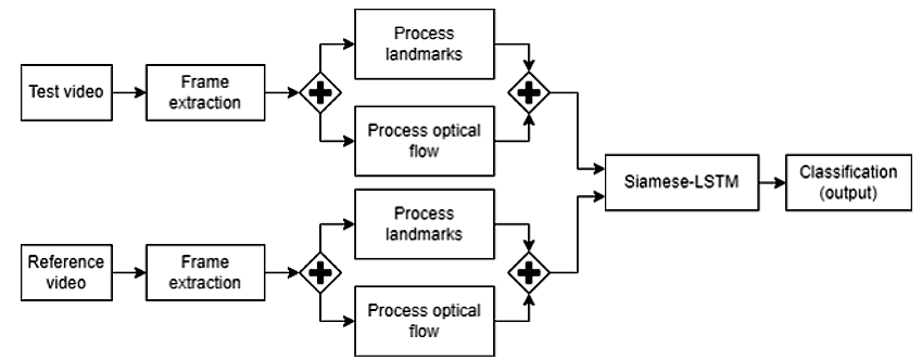 El modelo propuesto para la detección de ataques de presentación en la autenticación por biometría facial consiste en una red Siamese-LSTM alimentada con registros conformados por información del flujo óptico y los puntos de referencia facial. La Fig. 7 muestra el proceso general, que consiste en la extracción de los fotogramas con los que se obtienen los puntos de referencia facial y el flujo óptico, los cuales se combinan para formar los registros de entrada. Después, con los registros generados se realiza la ejecución de la red Siamese-LSTM para obtener los encodings y finalmente se realiza el proceso de clasificación, donde se indica si los dos videos corresponden a la misma clase (genuino o ataque).