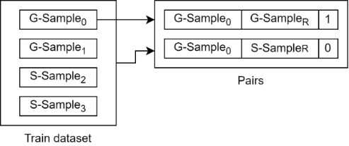 Para realizar el proceso de entrenamiento del modelo, se generó una lista con pares de videos seleccionados así: Se recorre todo el dataset, y si el índice del i-ésimo video (muestra), es impar, se selecciona de manera aleatoria un video de la misma clase (genuino o fraudulento) de entre todo el dataset, si el índice es par, la selección se hace entre todos los registros del mismo sujeto. Con estos videos se generan dos pares, uno de ellos conformado por la muestra del dataset y un video de referencia de la misma clase y el otro por la muestra y un video de la clase opuesta. El par constituido por muestras de la misma clase se etiquetan con 1 y el otro par de muestras de diferente clase con 0. Al final el dataset de entrenamiento que contiene N muestras genera un dataset de tamaño 2*N. La Fig. 8 muestra cómo a partir de una muestra del dataset (G-Sample0) se generan dos pares: uno conformado por G-Sample0 y una muestra aleatoria del dataset G-SampleR con etiqueta 1, y el otro conformado por G-Sample0 y una muestra de la clase contraria S-SampleR con etiqueta 0.