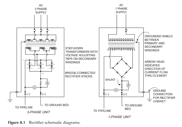 Un rectificador de protección catódica es una máquina que convierte energía proveniente de una red de corriente alterna (AC) en corriente directa (DC). A esta máquina se conecta el terminal negativo a la tubería y el terminal positivo a la cama anódica y mediante el ajuste de taps se configura la corriente que se inyecta a la cama anódica para proteger la tubería