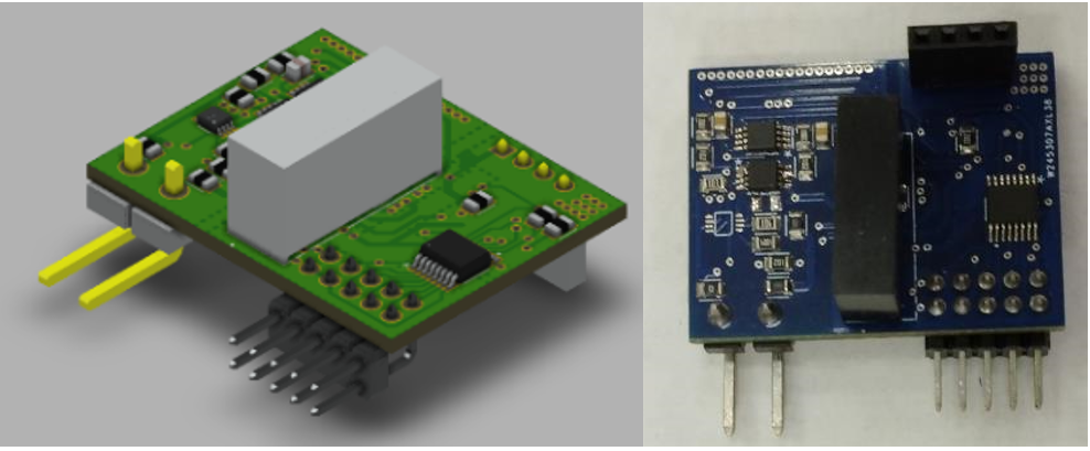 La placa de adquisición analógica se diseña teniendo 2 planos de potencia aislados eléctricamente: un plano flotante para el componente analógico del circuito y un plano común para conexión con el módulo concentrador de adquisición. La selección de componentes, su disposición sobre el circuito impreso y el diseño de los trazados se realizó de tal forma que mantuviese un voltaje de ruptura de 2KV entre los terminales de entrada de señal analógica y las terminales de alimentación y control digital. En la Fig. 4 puede evidenciarse el diseño 3D de la placa y su implementación final.