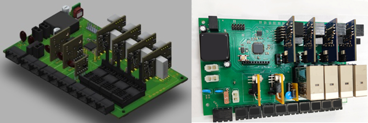El circuito impreso fue diseñado sectorizando relés, placas de adquisición, entradas y salidas digitales, microcontrolador y componentes de regulación. En la parte derecha del diseño se encuentran los componentes relacionados con la adquisición de señales, la izquierda con la entrada de alimentación y regulación de potencia y en el centro los componentes asociados a control digital. Esta disposición de componentes se hace de tal forma que permita el fácil reemplazo de alguno de los componentes y para aislar arcos eléctricos generados por sobretensiones. Se adoptan también medidas para reducir los efectos de arcos eléctricos y salvaguardas para minimizar potenciales cortocircuitos. En la Fig. 5 se observa el diseño 3D de la placa y su implementación final.