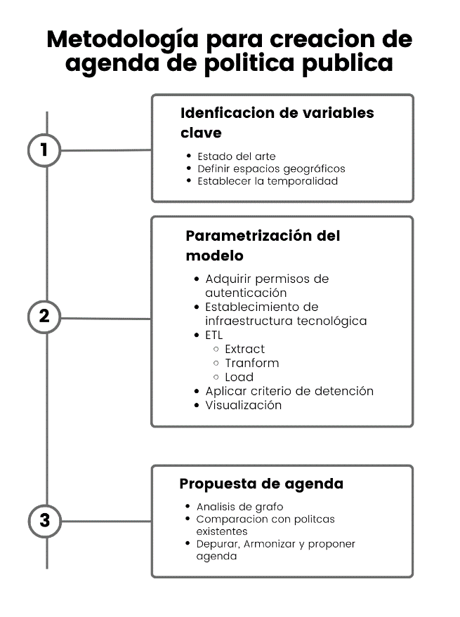 El modelo de aplicación consta de tres etapas desarrolladas de manera secuencial, el primero orientado a la identificación de los factores clave para el buen desarrollo del módulo, la segunda etapa consta de como los datos son tomados de muestras aleatorias, cumpliendo indicadores estadísticos mínimos de calidad, a través de las API’s desarrolladas para dicho objetivo, implementadas desde Python, realizado los procesos ETL’s y visualización, por último la etapa tres consta del análisis exploratorio y de la visualización para llegar así a la creación de la agenda en políticas públicas.