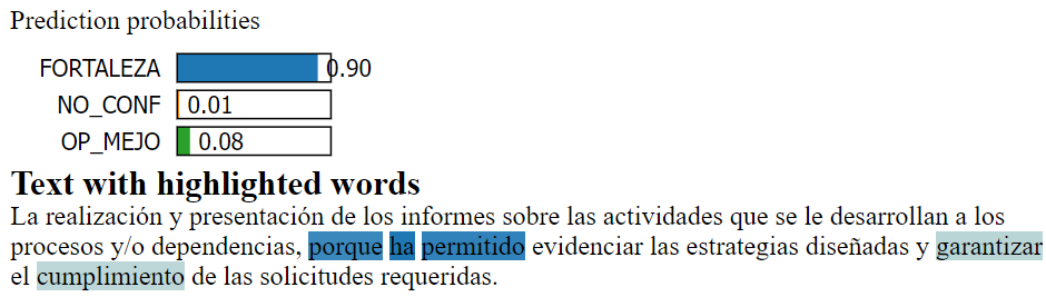 La figura 1, se ilustra la explicación de una instancia específica del conjunto de datos de pruebas que fue clasificada como "fortaleza". En esta explicación, se destacan las palabras clave "porque" y "permitido", las cuales tuvieron una influencia significativa en la predicción resultante.