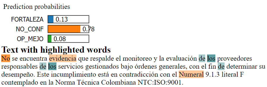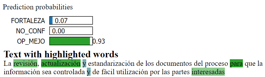 La figura 2 presenta la salida del modelo para una instancia asociada a una oportunidad de mejora. En esta visualización, se evidencian palabras como "revisión", "actualización" e "interesadas" las cuales tuvieron una contribución positiva en la clasificación de esta instancia.