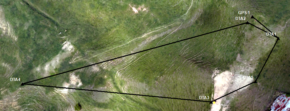 Una vez se georreferenciaron los dos puntos con los equipos GNSS, se procedió a armar la estación total en DTA1 y se dio línea a GPS1 para así orientar la estación total. A continuación, se realizó una poligonal con 5 deltas, tal y como se aprecia en la figura 2. Ahora, es preciso tener en cuenta que la diferencia de distancias entre los deltas se debió a la dificultad de obtener visual en algunos puntos, dados los desniveles del terreno.