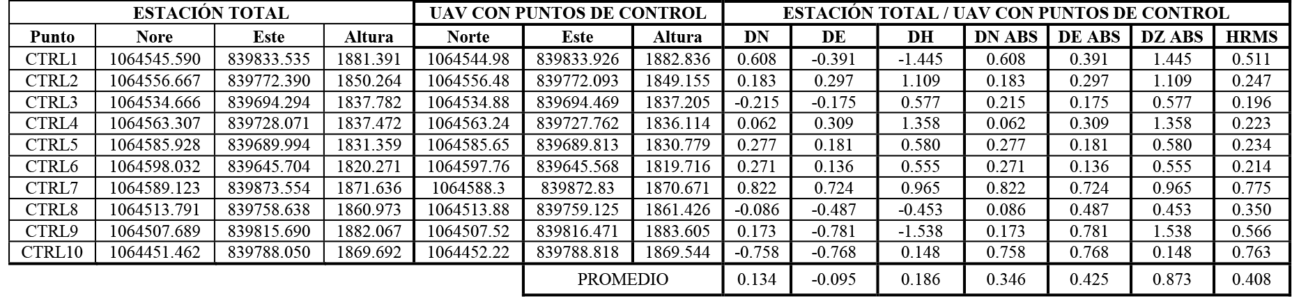 Para el caso comparativo entre la estación total y UAV apoyado de puntos de control se tuvo una diferencia mucho mayor en todos los ítems analizados, tal y como se puede observar en la tabla 5. Atendiendo al error medio cuadrático horizontal se tiene un promedio de 0.408 m y un error promedio absoluto en la vertical de 0.873 m. Por otro lado, al analizar el promedio de las diferencias, se observa que en la componente norte se tiene un desfase de 0.134 m, en la componente este de -0.095 m y en la altura de 0.185 m. Lo que es un indicativo de que no existe un desplazamiento general, ya sea vertical u horizontal del conjunto UAV con puntos de control, sino discrepancias alrededor de todo el conjunto de datos.
