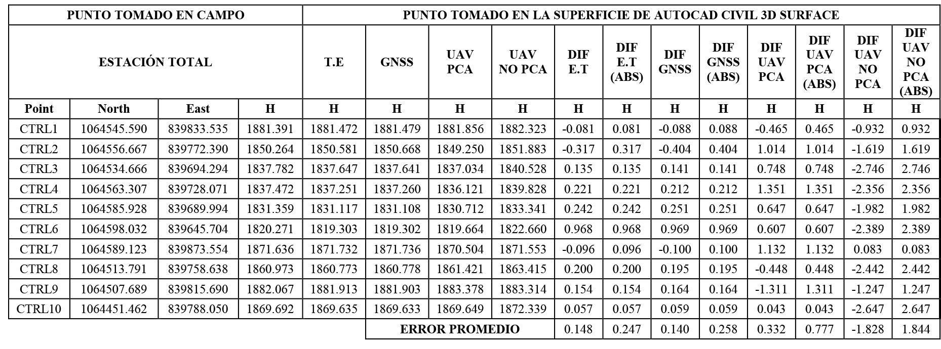 Usando las coordenadas de los puntos de control tomadas con la estación total como base, se procedió a comparar las alturas de terreno en las superficies generadas por el software AutoCAD Civil 3d, como se observa en la figura 7. En este caso sí se incluyó el modelo generado de los vuelos con UAV sin puntos de control aéreo.