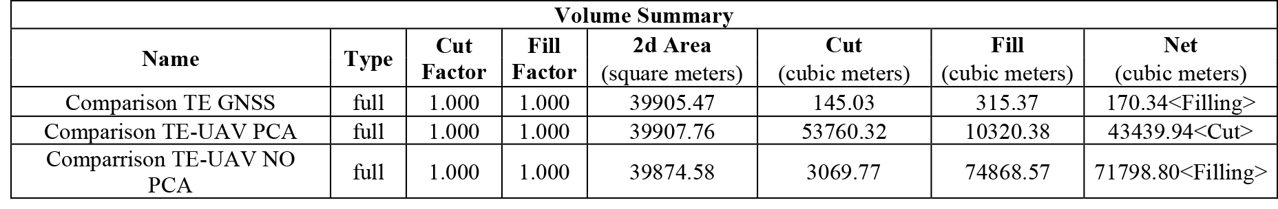 En primera instancia, se realizó una inspección visual del conjunto de curvas de nivel obtenidas con cada una de las tecnologías. En segundo lugar, se procedió a realizar un cálculo de volúmenes de cortes y llenos, tal y como se observa en la tabla 7. Finalmente, se procedió a dividir las diferencias de volúmenes en el área total de estudio y así obtener una diferencia de altura promedio entre las superficies. Para este ejercicio comparativo se tomó como base la superficie generada por los datos adquiridos con la estación total.