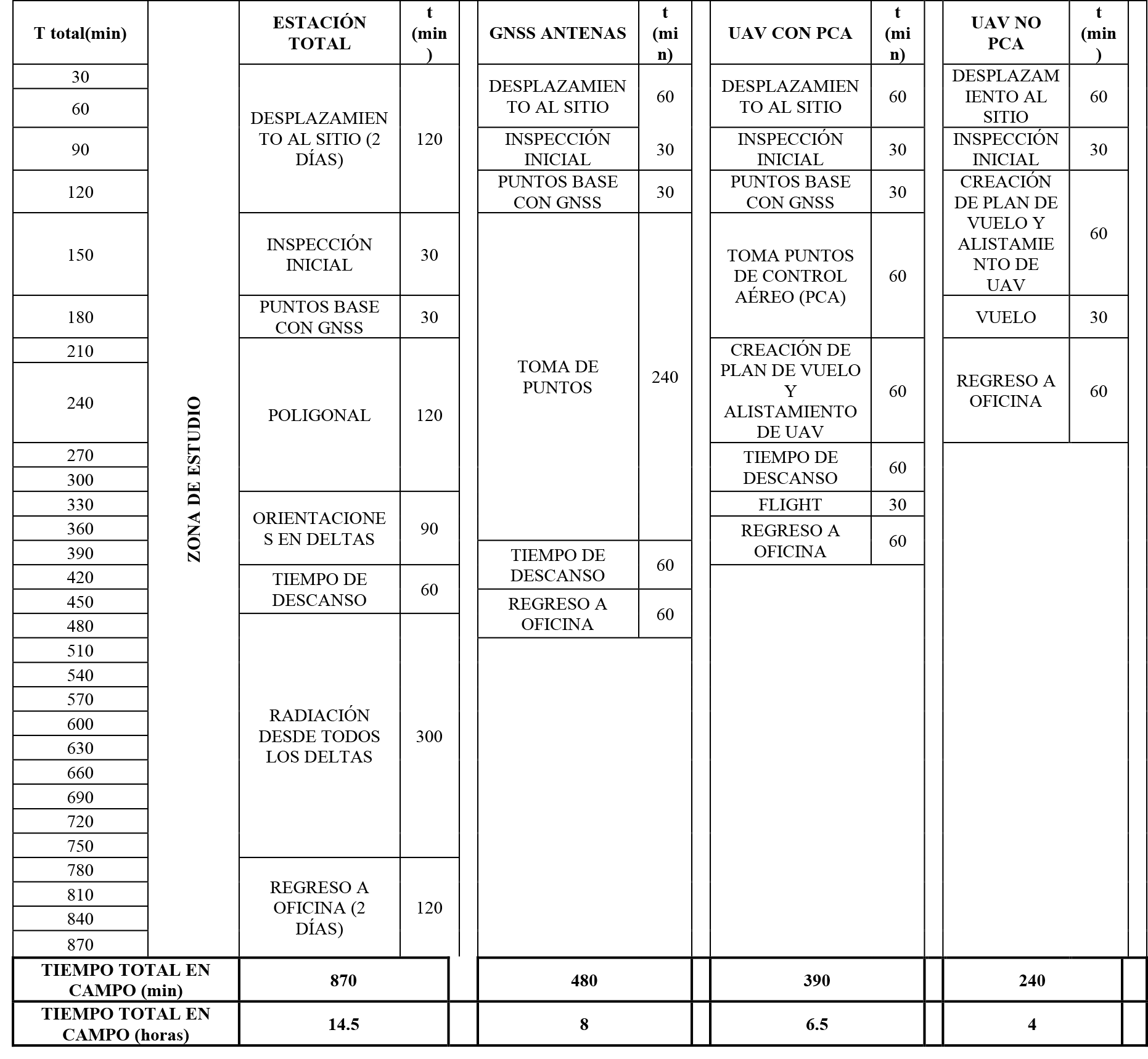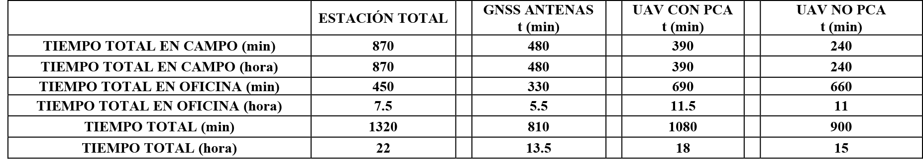 Para este análisis se dividieron los métodos en dos partes, trabajo de campo y trabajo de oficina. Para determinar los tiempos individuales de la estación total se tomaron en consideración para este análisis los periodos de la creación de la poligonal, los cambios de armada y la ubicación del prisma. En el caso particular de las antenas GNSS, se tomó en cuenta el tiempo en que la antena Rover tardó en fijar el punto a referenciar. Adicionalmente, en todos los casos se tuvo en cuenta el tiempo requerido para el desplazamiento desde la oficina hasta el terreno, la hora de comida (en casos en los que el tiempo en terreno superase las 4 horas), el cual se incluyó en el ítem “tiempo de descanso”, las pausas para hidratación se incluyeron en el caso de la estación total en el ítem “radiación de todos los deltas” y para el caso de las antenas GNSS en el ítem “toma de puntos”.
