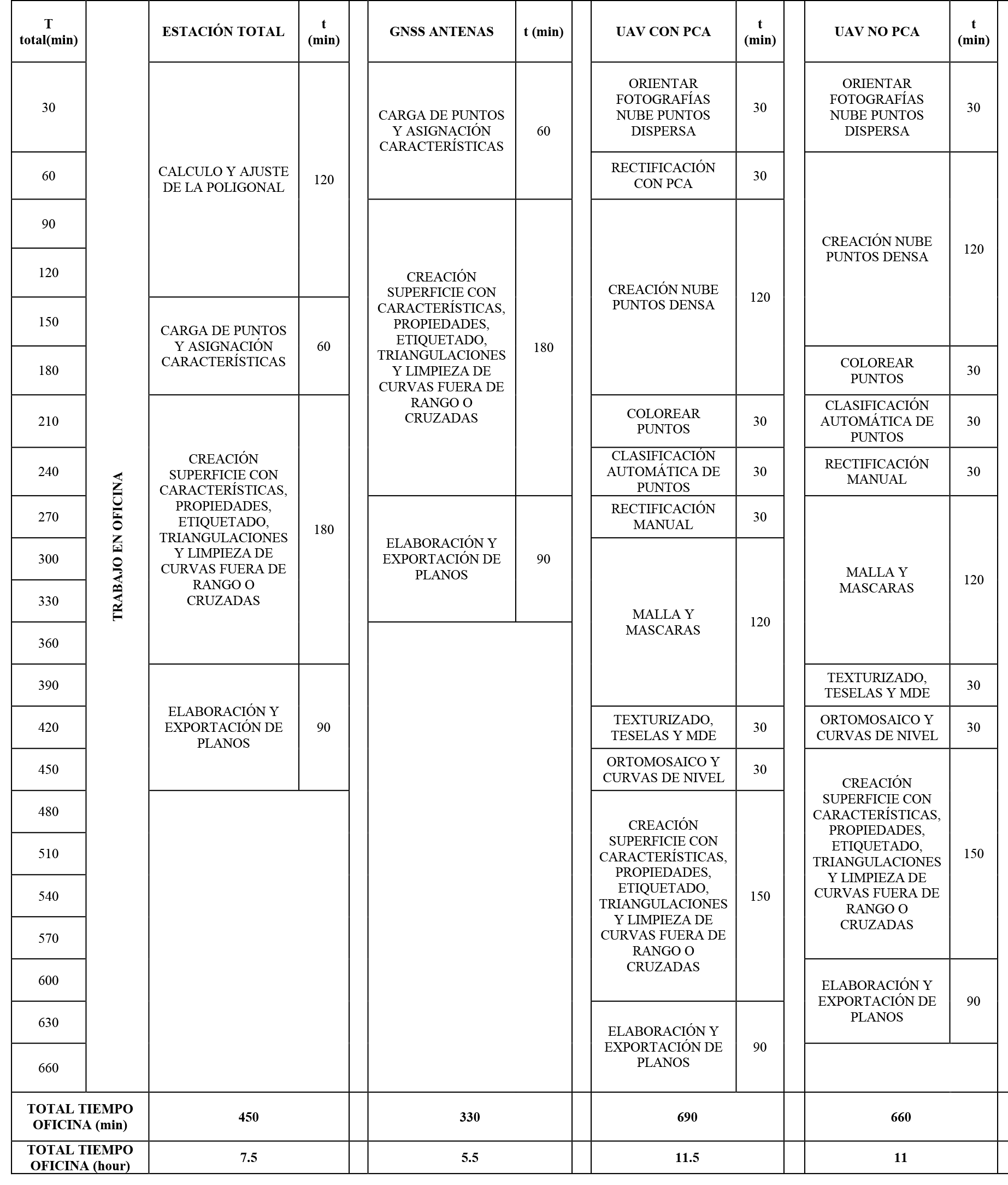 En el apartado de trabajo de oficina se tomó como base la creación de un plano que represente el terreno mediante curvas de nivel. Los procesamientos fotogramétricos son los que necesitaron una mayor cantidad de tiempo, con un total de 11.5 horas para UAV con puntos de control aéreo, y 11 horas para UAV sin puntos de control aéreo. Ahora, se debe tener en cuenta que la mayor parte de los procesos fotogramétricos son automáticos, y la velocidad con los que se completan depende en gran medida de la potencia del equipo informático utilizado. Para la creación del presente plano, los únicos procesos que necesitaron atención durante su desarrollo fueron la rectificación con puntos de control, la clasificación manual de puntos y los procesos comunes a todos, como el ítem de creación de superficies y elaboración de planos. Mientras tanto, la diferencia entre estación total y antenas GNSS radica en la necesidad de dedicar tiempo al cálculo y ajuste de la poligonal. En este último apartado la tecnología que requirió menos tiempo fueron las antenas GNSS. En la tabla 9 se puede observar de manera detallada los tiempos de oficina asociados a cada uno de los métodos analizados.