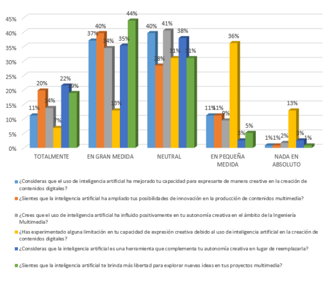 Un temor que ha nacido debido al auge y potencial de las herramientas de inteligencia artificial dentro de las áreas que hacen parte de la ingeniería multimedia se encuentra en que sí estas podrían estar limitando la capacidad creativa de los estudiantes del pregrado, lo cual influiría de forma negativa en sus aptitudes para innovar y poder expresarme de forma creativa al momento de estructurar y desarrollar contenidos digitales. De forma neutral, los datos recabados por la encuesta que están relacionados con el aspecto antes señalado permiten disipar en buena medida el temor a un papel de la inteligencia artificial cómo limitante de la autonomía creativa en los estudiantes del pregrado en ingeniería multimedia de la Universidad Simón Bolívar sede Cúcuta durante el semestre académico 2023-2. Sin embargo, como se evidencia en 5igura 4 es interesante observar cómo existe cierto escepticismo de la muestra respecto a asegurar que no han experimentado limitaciones en su creatividad al momento de usar herramientas de inteligencia artificial, puesto que un 50% de las respuestas a la pregunta ¿Has experimentado alguna limitación en tu capacidad de expresión creativa debido al uso de inteligencia artificial en la creación de contenidos digitales? se concentran en las opciones que se clasifican cómo NEUTRAL, EN GRAN MEDIDA, y TOTALMENTE (en estas dos últimas opciones en menor medida). Además, en las preguntas ¿Consideras que la inteligencia artificial es una herramienta que complementa tu autonomía creativa en lugar de reemplazarla? y ¿Sientes que la inteligencia artificial te brinda más libertad para explorar nuevas ideas en tus proyectos multimedia?, los porcentajes que se ubican en las opciones NEUTRAL, EN PEQUEÑA MEDIDA y NADA EN ABSOLUTO son 44% y 37% respectivamente (claro está que en las últimas dos opciones en muchísima menor medida). El escepticismo mencionado puede entenderse cómo el resultado de la simplificación de procesos que permiten las herramientas de inteligencia artificial en el desarrollo de contenidos digitales, ya que en varios casos el resultado final de un contenido no dista mucho de ser diferente al output que generó la IA, incluso puede que el ingeniero multimedia en formación, simplemente, haya retocado el contenido generando cambios muy mínimos. Sin embargo, hay que tener cuidado en caer en una generalización, ya que también se presentan casos en que si bien el contenido realizado por el estudiante mantiene cierta relación con el output que generó la herramienta, al comparar ambos se podrá evidenciar diferencias sustanciales que demostrarán la capacidad creativa del estudiante y la originalidad del contenido. Otro escenario que se puede contemplar, es que en ocasiones los ingenieros multimedia en formación usan estas herramientas con el propósito de vencer bloqueos creativos o generar piezas que les sirvan de inspiración al momento de desarrollar contenidos digitales, por lo que en relación a los outputs o respuestas de la herramienta, el contenido generado puede no guardar semejanza alguna. No obstante, hay que recalcar que la opción NEUTRAL solo demuestra escepticismo que puede catalogarse cómo inseguridad al momento de que algunos individuos de la muestra decidieran si respondían de forma positiva o, por el contrario, de forma crítica a las preguntas mencionadas, por lo que si se despreciara el porcentaje que pertenece a dicha opción, podríamos observar que el panorama es más positivo que crítico, puesto que, el 48% de la muestra responde EN GRAN MEDIDA y TOTALMENTE a la pregunta ¿Consideras que el uso de inteligencia artificial ha mejorado tu capacidad para expresarte de manera creativa en la creación de contenidos digitales?, el 60% de la muestra responde EN GRAN MEDIDA y TOTALMENTE a la pregunta ¿Sientes que la inteligencia artificial ha ampliado tus posibilidades de innovación en la producción de contenidos multimedia?, y el 48% de la muestra responde EN GRAN MEDIDA y TOTALMENTE a la pregunta ¿Crees que el uso de inteligencia artificial ha influido positivamente en tu autonomía creativa en el ámbito de la Ingeniería Multimedia?