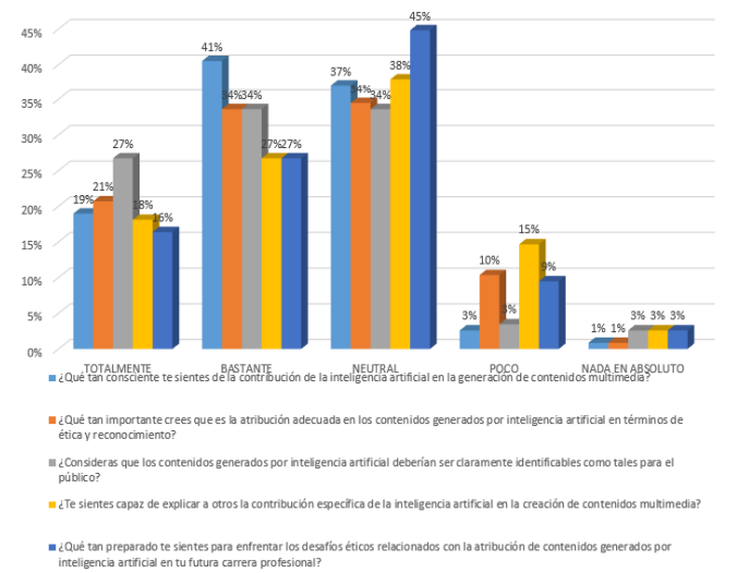 El propósito de recabar datos en torno a este aspecto es conocer el grado de comprensión que tienen los estudiantes del pregrado en Ingeniería Multimedia de la Universidad Simón Bolívar sede Cúcuta durante el semestre académico 2023-2 respecto a la relación de trabajo colaborativo (por referirse a este proceso de alguna manera) que existe entre su creatividad y las herramientas de inteligencia artificial, así como observar qué tanta conciencia poseen referente a la atribuir autoría de manera correcta cuando es debido. El aspecto fundamental a evaluar en este objetivo, por tanto, radica en evidenciar el vínculo creatividad humana - inteligencia artificial dentro del contexto del desarrollo o elaboración de contenidos digitales, a la par que identificar, a través de las respuestas consignadas por la muestra, la percepción del estudiantado del pregrado en cuanto al imperante ético de atribuir de manera adecuada la autoría dentro del actual contexto tecnológico Los datos recabados en la figura 5 ponen de manifiesto una conciencia colectiva de la muestra referente a: la considerable contribución que hace la inteligencia artificial (herramientas de inteligencia artificial generativa) en la creación de contenidos multimedia, la necesidad de atribuir de forma adecuada dentro de los contenidos generados por herramientas de inteligencia artificial desde la perspectiva ética y el reconocimiento, y la importancia de señalar ante el público la procedencia de los contenidos generados por inteligencia artificial. Se puede constatar los antes mencionado por medio de las siguientes cifras: 1) referente a la pregunta ¿Qué tan consciente te sientes de la contribución de la inteligencia artificial en la generación de contenidos multimedia? el 60% de la muestra responde con la opciones BASTANTE y TOTALMENTE; 2) en relación al interrogante ¿Qué tan importante crees que es la atribución adecuada en los contenidos generados por inteligencia artificial en términos de ética y reconocimiento? el 55% de la muestra considera las opciones BASTANTE y TOTALMENTE; y 3) ante la cuestión ¿Consideras que los contenidos generados por inteligencia artificial deberían ser claramente identificables como tales para el público? el 61% de la muestra se decanta por las opciones BASTANTE y TOTALMENTE. A pesar de que el panorama aparenta inclinarse a un grado de conciencia notable de la muestra en términos de atribución de autoría y cuestiones éticas, lo cierto es que, nuevamente, se presenta un evidente escepticismo, específicamente en los datos recolectados de las últimas dos cuestiones que conforman la serie de preguntas dentro de la encuesta que se relacionan con la capacidad que asumen los estudiantes del pregrado para explicar a sus semejantes sobre las temáticas de contribución y atribución dentro del contexto actual del auge de la inteligencia artificial dentro de la profesión ya que: 1) el 56% de la muestra selecciona las opciones NEUTRAL, POCO y NADA EN ABSOLUTO (estas dos últimas en muchísima menor medida) para responder a la cuestión ¿Te sientes capaz de explicar a otros la contribución específica de la inteligencia artificial en la creación de contenidos multimedia?; y 2) el 57% de la muestra concentra en las opciones NEUTRAL, POCO y NADA EN ABSOLUTO (estas dos últimas, de nuevo, en muchísima menor medida respecto a la primera opción) su respuesta al interrogante ¿Qué tan preparado te sientes para enfrentar los desafíos éticos relacionados con la atribución de contenidos generados por inteligencia artificial en tu futura carrera profesional? Este escepticismo puede deberse a la falta de confianza o conocimiento que tienen los estudiantes sobre el tema, siendo entendible que este tipo de cuestiones éticas en un área cómo la inteligencia artificial se halla en constante evolución y pueden llegar a ser demasiado complejas de entender y describir. Es válido pensar que los estudiantes se hallen en proceso de comprender en su totalidad la complejidad de esta temática emergente dentro del contexto de la Ingeniería Multimedia, por lo que prefieren ser reservados al decantarse por un juicio más certero de su propia aptitud para abordar y afrontar los retos éticos en este particular ámbito de su futura trayectoria profesional.