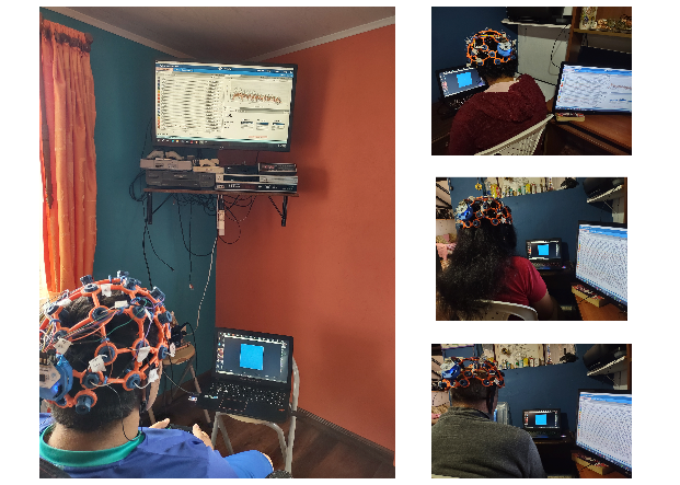 Fig. 3. Participantes durante las pruebas de generación de P300: 1/A (izquierda), 2/C (Derecha superior), 3/Ma (Derecha central) y 4/Mo (Derecha inferior).