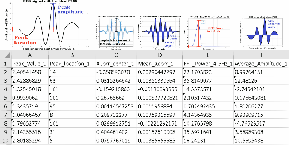 Todo se guardó en una hoja de cálculo (ver Fig. 4), dando un total de 96 características, por lo que las 6 características se calcularon para cada electrodo de los 16 que se usaron, y una columna adicional por el marcador de presencia o ausencia de P300.