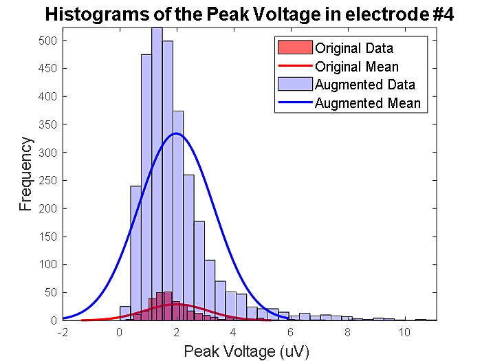 Fig. 5. Histogramas comparando entre datos del dataset original (rojo) con el dataset aumentado (azul).