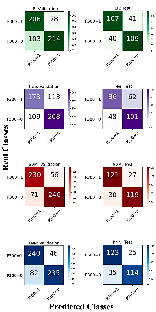Obtenidas las matrices de confusión de los participantes, involucrando tanto las de validación como las de prueba, para los cuatro tipos de modelos (ver Fig. 6), se observó que las matrices de confusión relacionados a SVM (Máquina de Soporte Vectorial) y KNN (K Vecinos más Cercanos) tienen un más alto número de verdaderos positivos y verdaderos negativos, comparados con los valores de LR (Regresión Logística) y Tree (Árbol de Decisión), los cuales tuvieron muchos más valores en los falsos, tanto positivos como negativos.