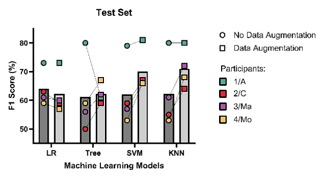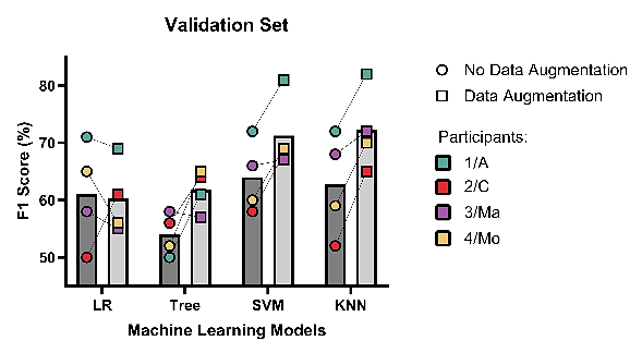 Realizando los cálculos del puntaje F1 de los cuatro participantes, y de ambos datasets por participante, siendo el original y el que tiene el aumento de datos, se obtuvo la siguiente gráfica (ver Fig. 7).