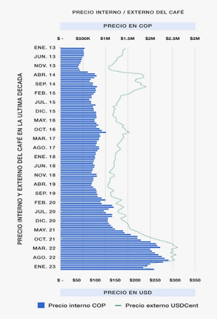 En la figura 1, se ilustra el comportamiento del precio interno y externo del café durante la última década, revelando una estrecha relación entre estos dos precios